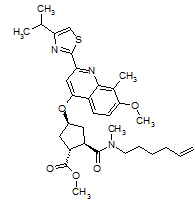中文名:1R,2R,4S)-2-[(5-己烯-1-基甲基氨基)羰基]-4-[[7-甲氧基-8-甲基-2-[4-异丙基-2-噻唑基]-4-喹啉基]氧基]环戊烷羧酸甲酯
